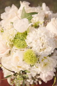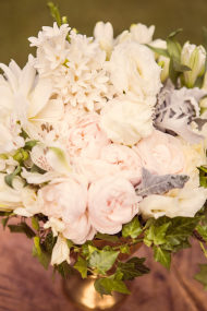 -A floral in a copper/bronze vase placed on the side table. Unstructured arrangements with soft white, ivory and greenery.
