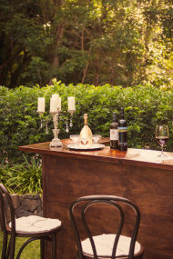 An sophisticated Cocktail Bar was also set-up with a dark wooden bar and 3 dark oak original Bentwood high bar stools, french grey candelabra, whiskey decanters and glasses.