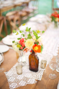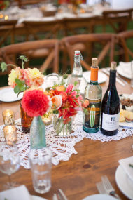 We felt that a vintage romantic theme fit the venue perfectly and would allow us to use elements of family heritage, heirlooms and flea market treasures. After I found my dress it really resonated with the theme and feeling, we knew we wanted everything to be really soft with pops of color. I fell in love with the lace and bead detailing and knew that everything about the wedding décor would have to compliment this gorgeous dress. We landed on a color palette of coral, orange, sand and succulent. Pop of color but also soft accents to not overpower the beautiful green outdoor setting.