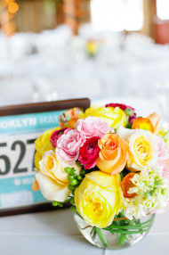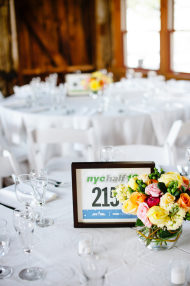 Chris and Erin wanted a wedding that was about friends and family and all the things they held dear. The Red Barn in Amherst, MA was a perfect location combining stunning outdoor scenery (check out that epic tree from which they hung glass bubbles) and a rustic indoor space for dancing. The details couldn’t have been more personal; Erin and Chris used their racing bibs from various marathons they had run together as table numbers and the place cards told their guests that in lieu of favors, a donation was being made to the Humane Society in honor of their cats.
